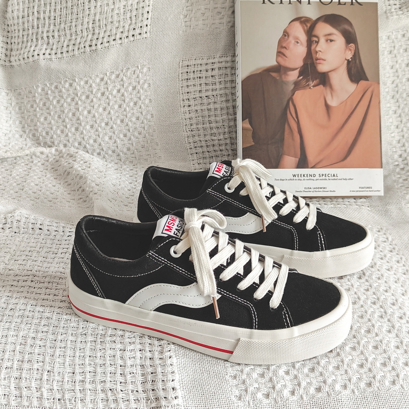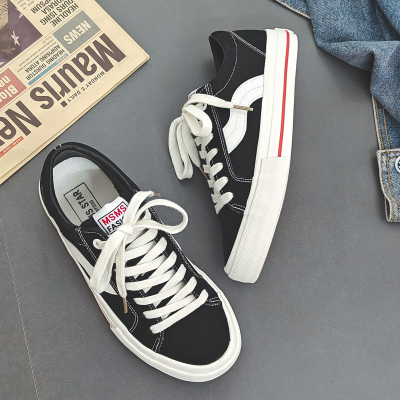 These black and white sporty casual shoes combine classic design with modern elements, delivering a versatile and stylish look for any occasion. The upper is crafted from premium canvas material, ensuring lightweight breathability and lasting comfort. The signature white wave stripe adds a dynamic and unique touch, while the reinforced white rubber toe cap and outsole enhance durability and slip resistance. A subtle red accent along the midsole adds a pop of color, giving the design a fresh and vibrant feel. The cushioned insole and soft inner lining provide superior comfort, keeping your feet relaxed throughout the day. Perfect for daily commutes, streetwear, or casual outings, these sneakers are a must-have addition to your wardrobe.