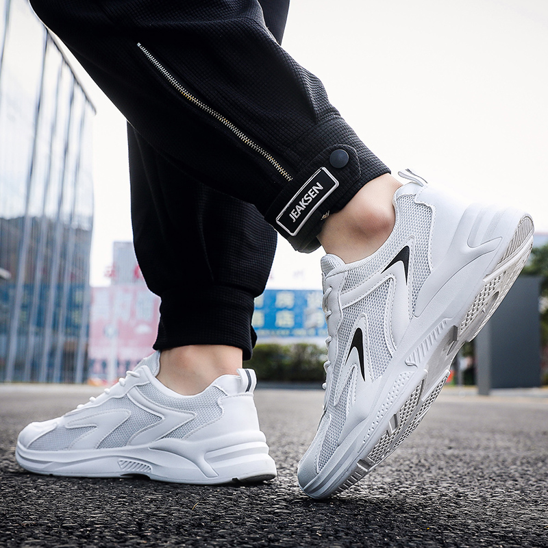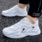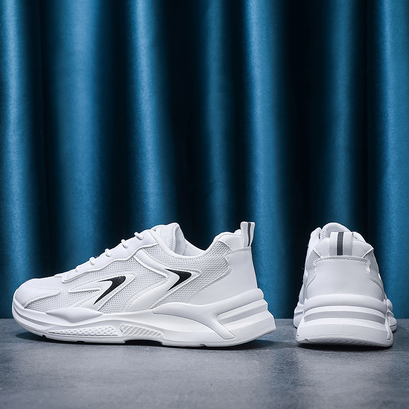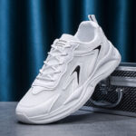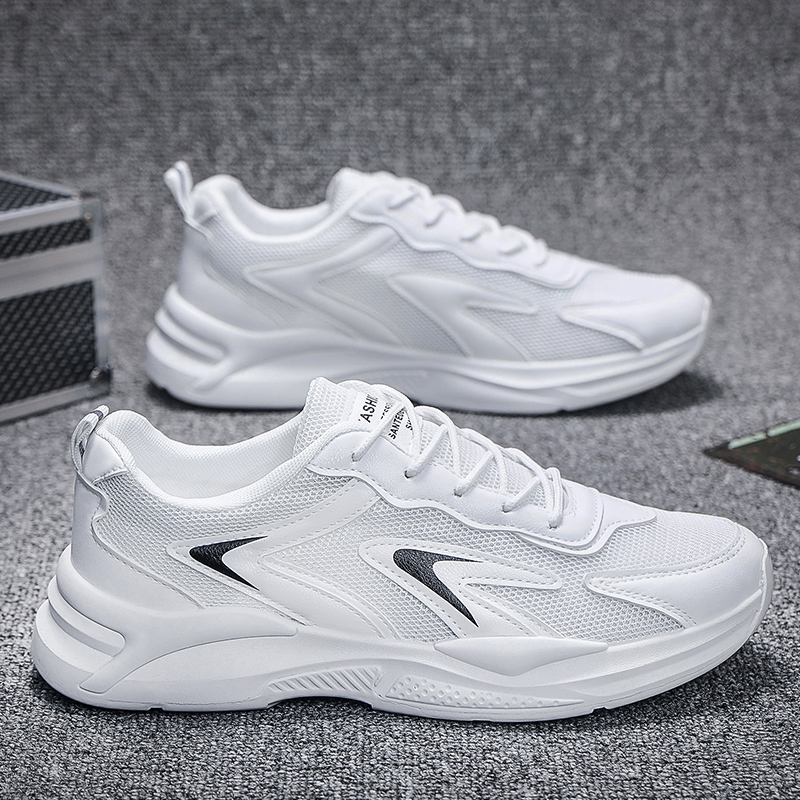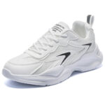 These all-white sneakers feature a minimalist design enhanced with black decorative lines, creating a clean and stylish look. The upper is crafted from high-quality mesh and synthetic leather, combining breathability and durability to keep your feet comfortable all day. The lightweight sole provides excellent cushioning, making these sneakers perfect for daily commutes, workouts, or casual outings.